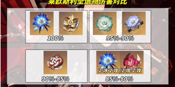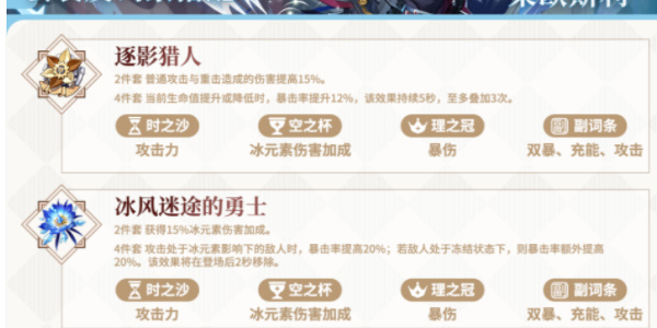 冰风迷途的勇士部分适配莱欧斯利,在永冻队中最优先推荐的圣遗物套装。遗憾的是不适合莱欧融化队,在面对某些自挂元素的怪物时几乎是白板。