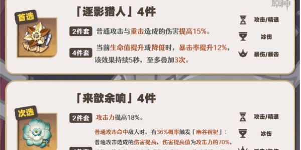 莱欧斯利是枫丹角色,且有枫丹特色烧血和自回血,因此第一建议当然是【逐影猎人】套装。猎人四件套完全适配莱欧斯利的圣遗物套装,无论是融化队、永冻队还是纯冰队都完美发挥。