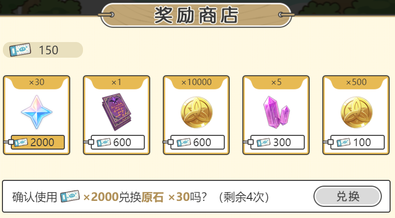 3、使用【乐园券】就能购买【奖励商店】里面的原石、摩拉经验书等奖励。