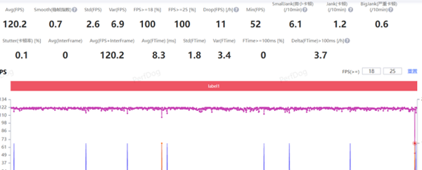 如果打开电竞模式,那么平均帧率120.2,稳帧指数0.7,整体游戏体验感觉良好。
