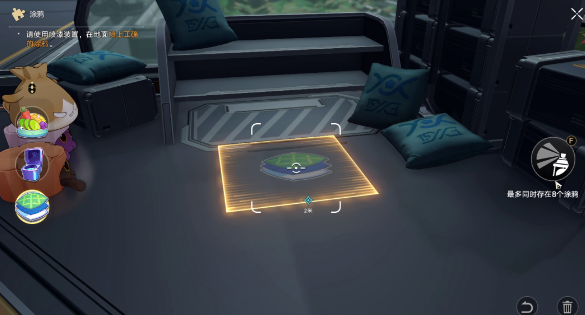 2、完成【休息区】和【进食区】布置,在休息区中喷射上【枕头】涂鸦,在晶石区喷上【果盘】涂鸦;
