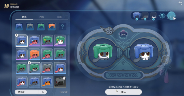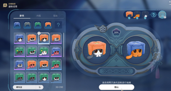 5、选择对应特征的两只,要是:蓝色的酥壳、灰色内陷、白色花纹点击即可培育;