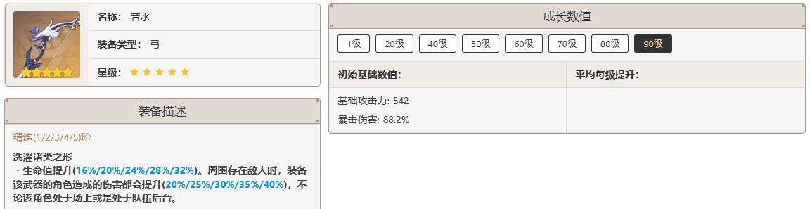 高额暴击伤害加成(88.2%),全伤害提升。输出向玩法优先考虑的武器。选择该武器时需要注意充能效率的堆叠,必要时优先考虑。