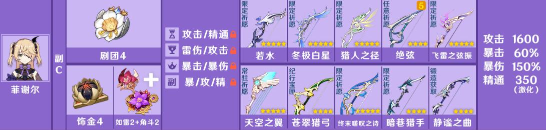 功能性和泛用性比较强,并且菲谢尔的攻击可以稳定触发其特效属性,能为全队提供攻击力与精通偏辅助向