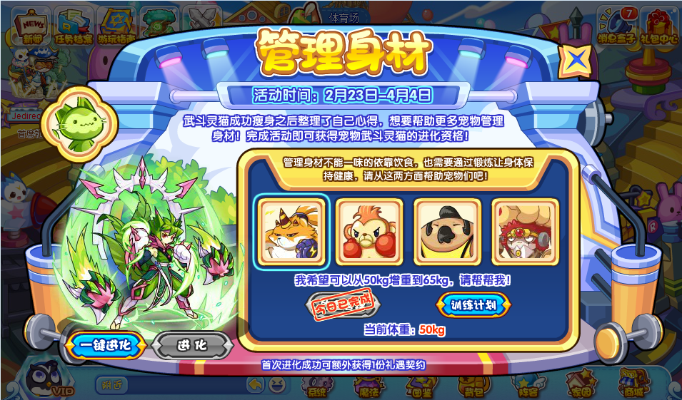 当四个宠物体重均达标后,就可以解锁:武斗灵猫 超进化资格啦!
